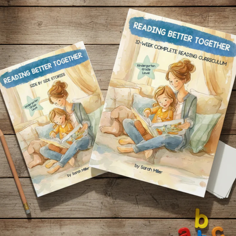 Reading Better Together Kindergarten isn't just another curriculum—it's a complete year of science-backed lessons created by a reading specialist and homeschool mom that takes your child from letters to reading real books. With 32 weeks of done-for-you lessons, 32 side-by-side stories where your child reads the sounds and words they know while you read the rest, plus step-by-step guidance that requires zero teaching experience, you'll raise a confident reader who begs for "just one more story."